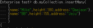 - insertMany() : 여러 개의 도큐먼트를 '배열'로 삽입