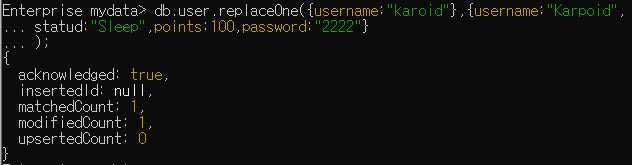 - upset 매개변수 : update + insert. 교체하거나 수정할 도큐먼트가 존재하면 설정된 조건대로 수정하고, 존재하지 않으면 새로 생성한다.