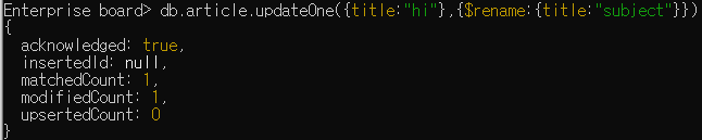 updateOne(), updateMany() : 특정 필드의 값을 바꾸거나 증/감시킬 수 있고, 필드 이름을 변경하거나 필드 자체를 삭제하는 기능 수행