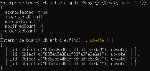 - 비밀 게시판의 추천수를 모두 1씩 증가($inc)