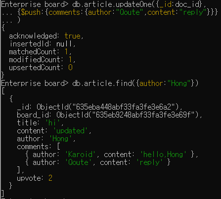- 댓글이 달린 자유게시판의 _id를 찾고 내용을 수정($set)