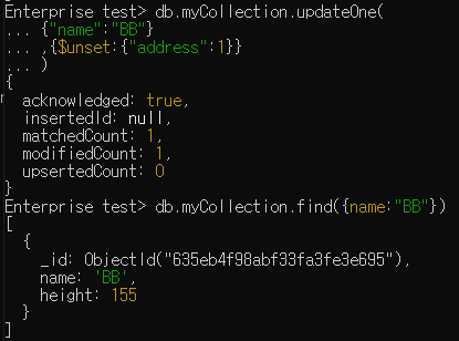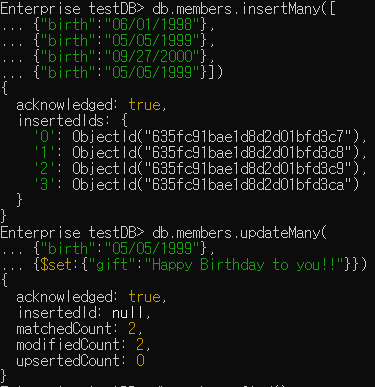 - $setOnInsert : 도큐먼트가 생성될 때 필드가 설정되어야 하는 경우가 있는데, 이후 갱신에서는 필드를 갱신하지 않아야 할 때 사용