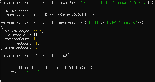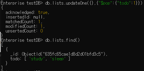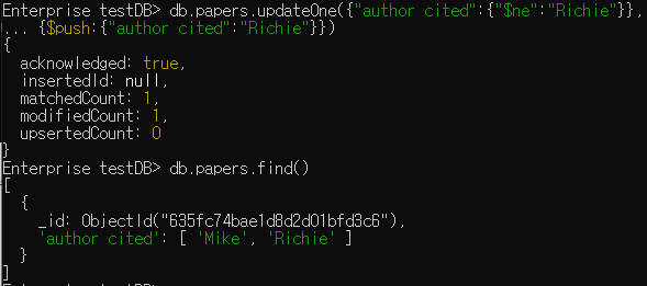 - 수정 연산자($addToSet) : $ne와 기능은 동일, 배열에 값이 없을 때 추가됨