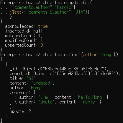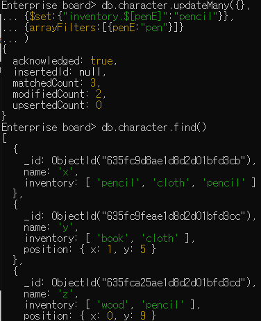 - arrayFilters : 필드 값이 배열인 경우의 수정 방법