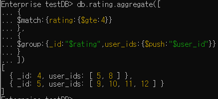 - $group : 그룹화. 산술 연산, 극한 연산, 배열 연산을 지원. _id 필드를 기술하지 않으면 "오류"가 발생