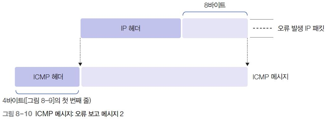 - ICMP는 단순히 오류 발생 사실을 통보하는 것이므로 오류를 해결하는 것은 상위 계층의 몫