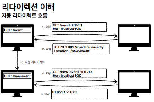 ※ 리다이렉션 : 웹 브라우저는 3XX 응답의 결과에 Location 헤더가 있으면, Location위치로 자동 이동