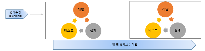 - 고객의 요구사항 변화에 민첩하게 대응할 수 있도록 일정한 주기를 반복하면서 개발 진행